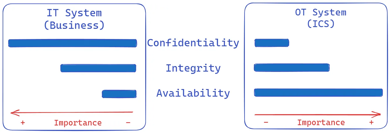 En redes OT, la disponibilidad es la prioridad principal, ya que estas redes están diseñadas para controlar el funcionamiento y la producción de instalaciones industriales como refinerías, plantas energéticas y maquinarias pesadas. Si la red OT deja de funcionar, puede causar interrupciones en la producción y la seguridad de los trabajadores, lo que provoca grandes pérdidas económicas. Después de la disponibilidad, la integridad es la segunda prioridad, ya que los datos y la precisión de los procesos son fundamentales para el funcionamiento adecuado de las instalaciones industriales. Por último, la confidencialidad ocupa el tercer lugar, porque la privacidad y el secreto comercial son menos relevantes en comparación con la disponibilidad y la integridad.